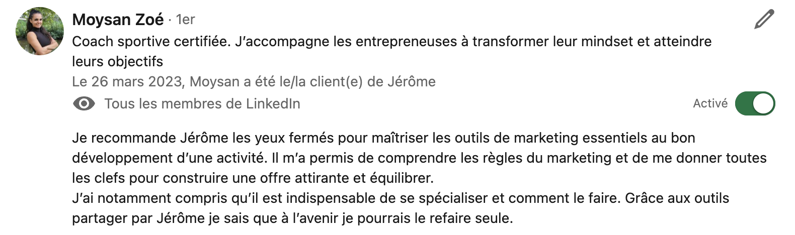 Mon offre vous permet donc de mettre en place très rapidement, une démarche commerciale concrète, opérationelle, outillée et efficace afin que vos clients vous sollicitent automatiquement, limitant au minimum vos activités commerciales et vous laissant un maximum de temps et d'énergie pour aider vos clients préférés.