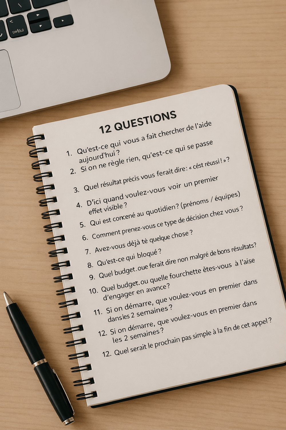 Voici 12 questions courtes, à utiliser en entretien, en message ou sur un petit formulaire, qui transforment des échanges vagues en rendez-vous clairs et des rendez-vous en missions.