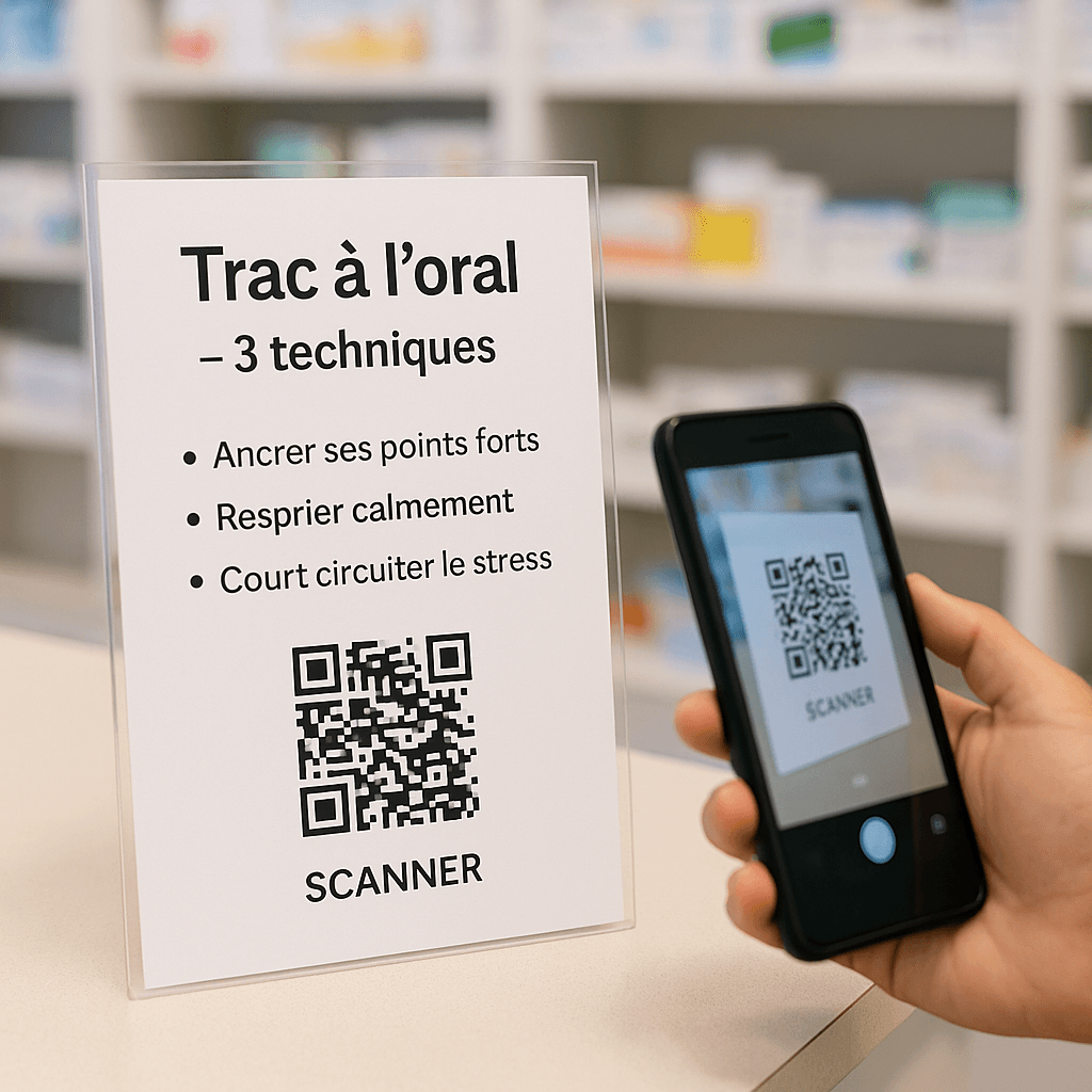 Affiche A4 chez 1–2 partenaires (pharmacie, lycée, salle de sport) avec QR vers la page